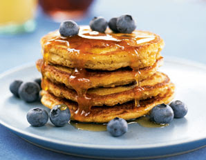 Mix one scoop natural whey protein isolate with 5 egg whites until combined. Add half cup rolled oats, 1 teaspoon cinnamon and 2 teaspoons of sugar. When thoroughly mixed, add in 10 fresh blueberries. Pour batter in a pre-heated pan and flip when golden brown around the edges. Makes 2 pancakes.